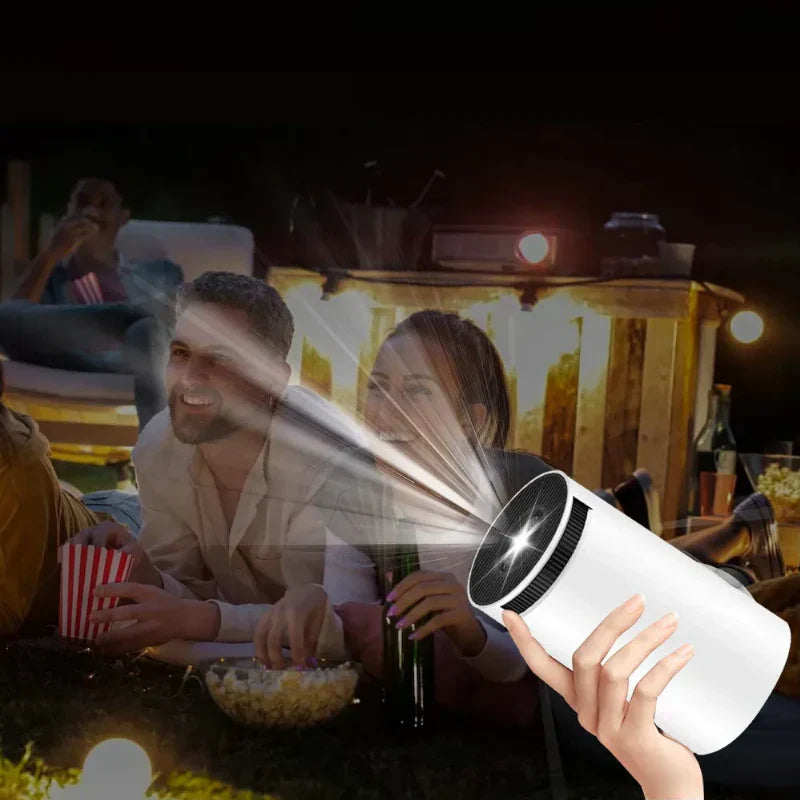 Projetor LED compacto com projeção de 40 a 200 polegadas, perfeito para entretenimento doméstico e cinema outdoor.